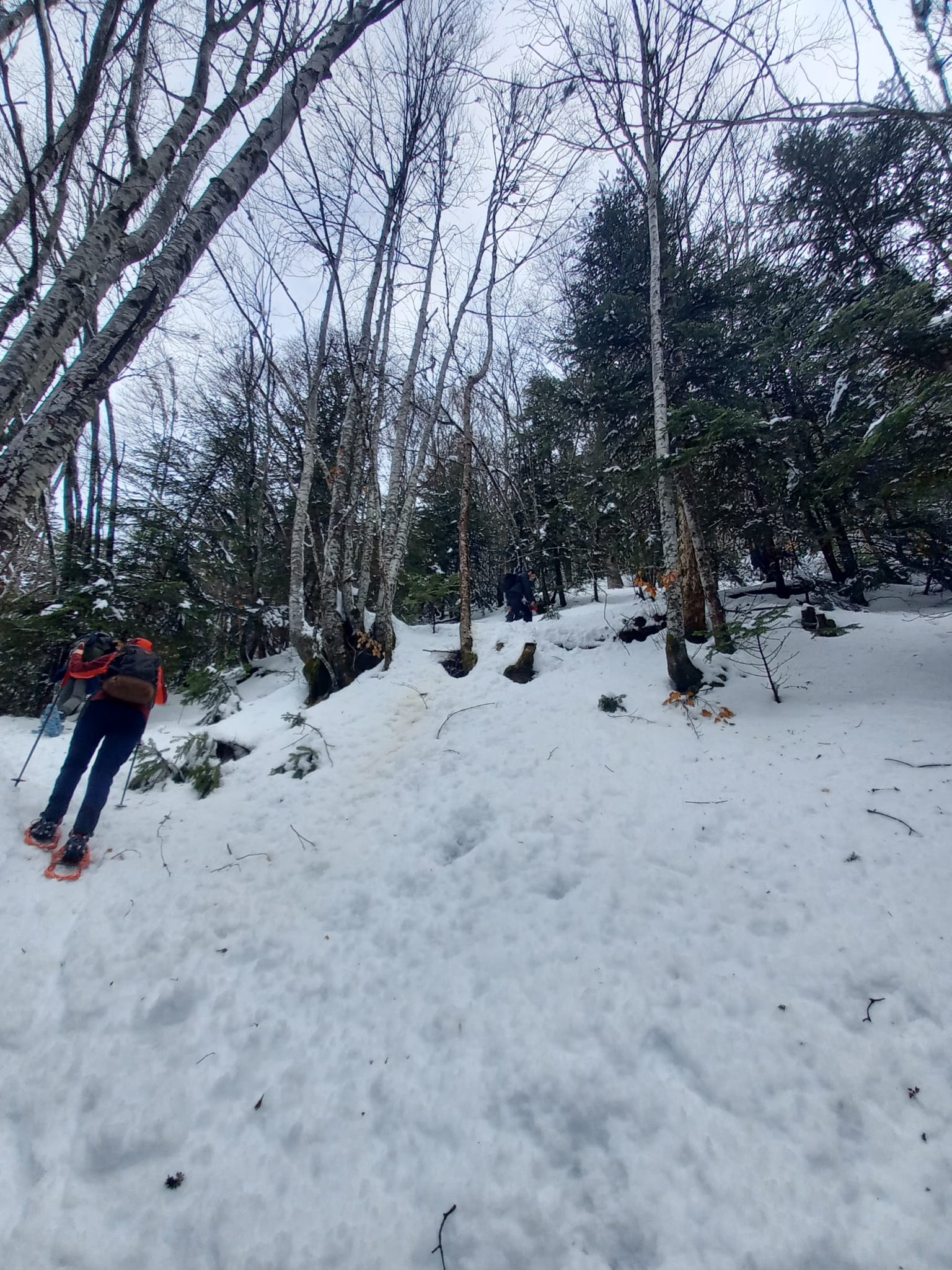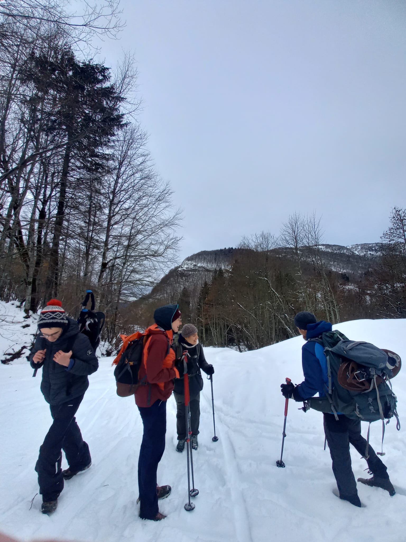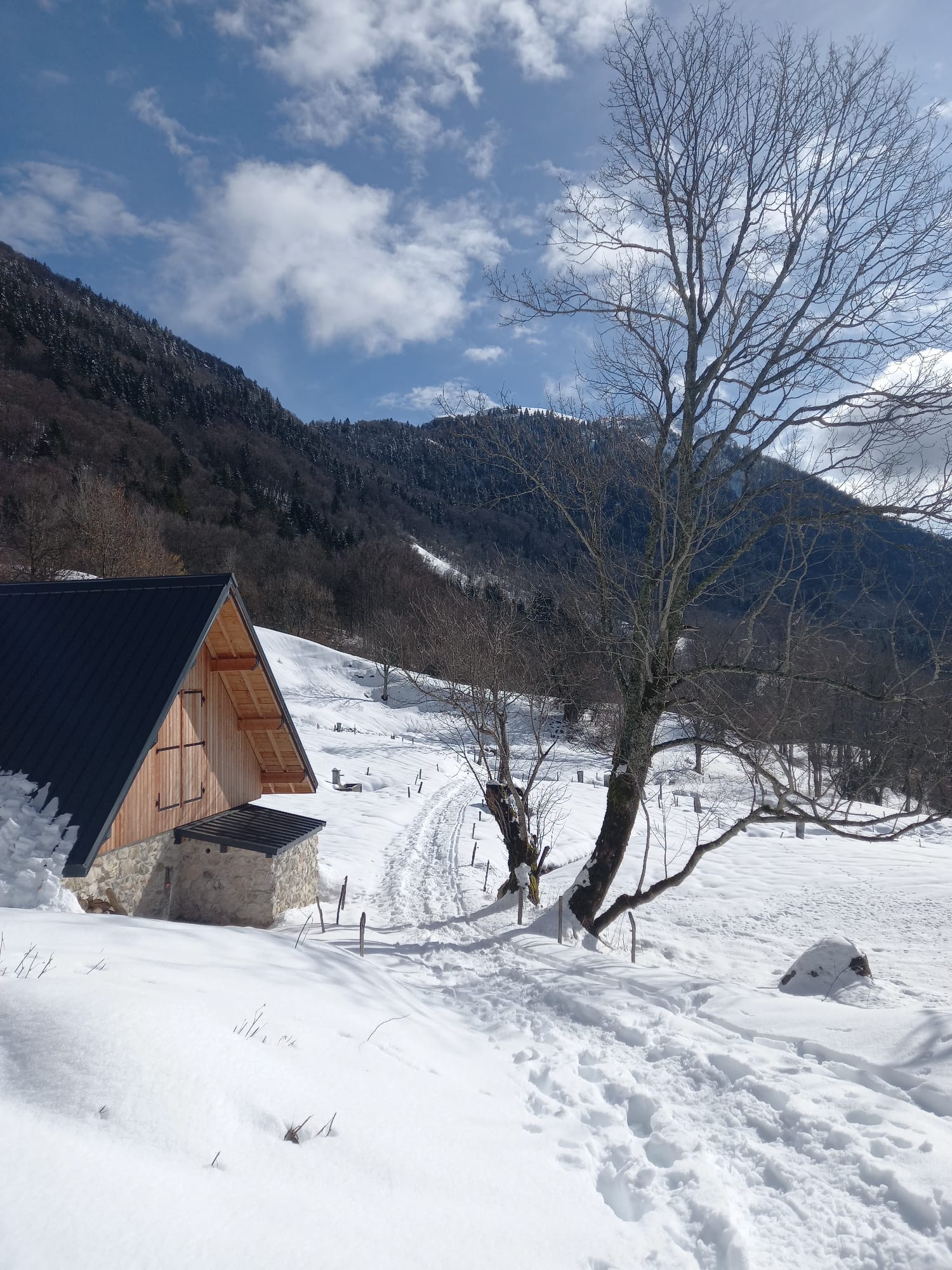 Nous avons commencé à marcher vers 9h. Nous avons serpenté les bois enneigés jusqu’au chalet.