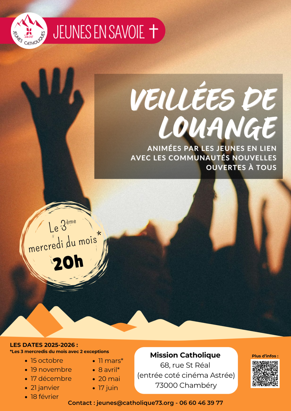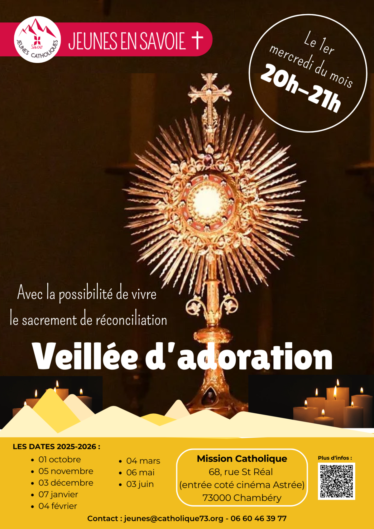 Le 1er mercredis du mois, de 20h à 21h, à la Mission Catholique à Chambéry (68 rue St Réal à Chambéry, accès côté cinéma Astrée), viens adorer le Seigneur ! La soirée est animée par les jeunes pros et ouverte à tous.