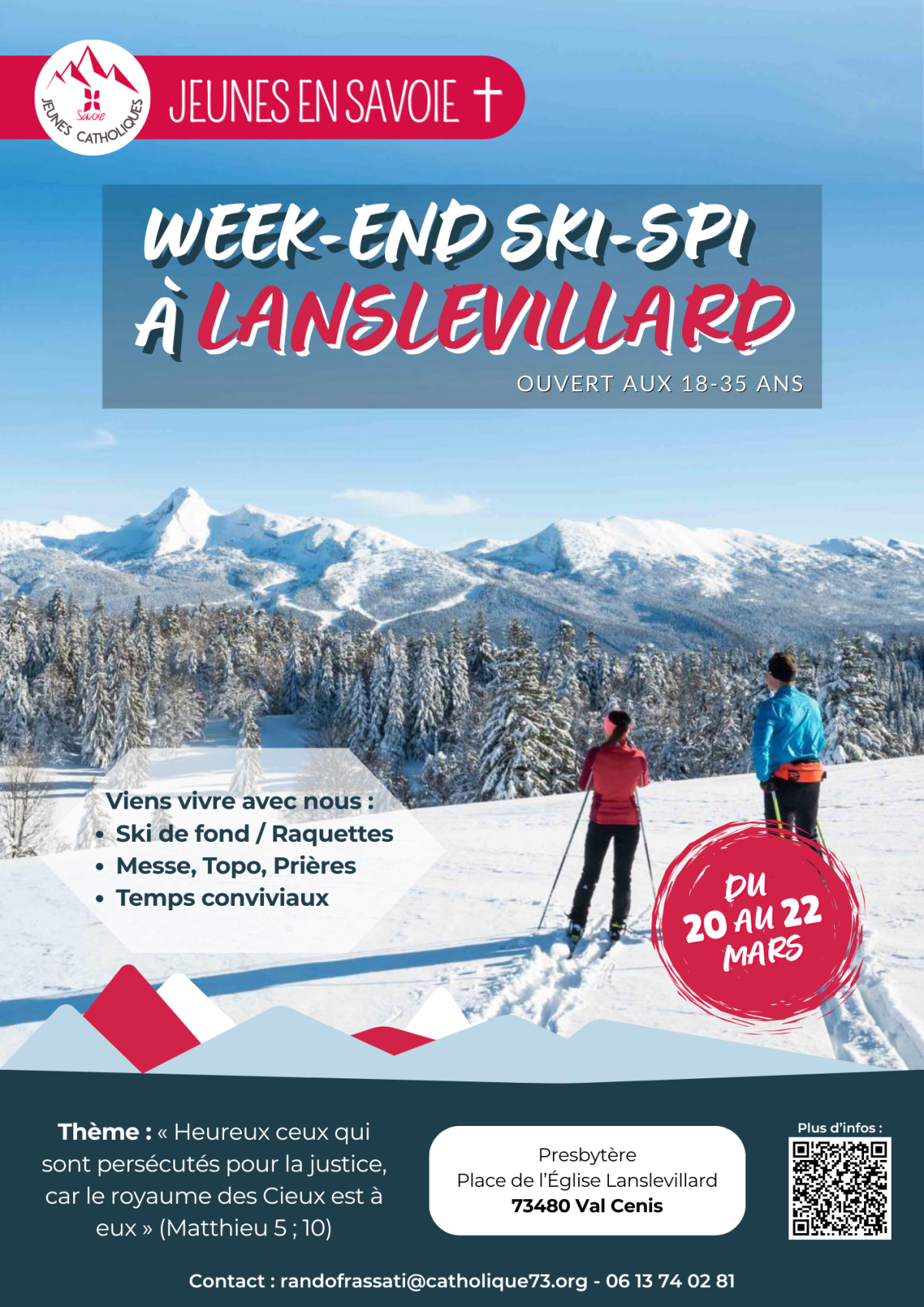 🎿Samedi : Activités enneigées : rando (raquettes) ou ski de fond, pique nique et topo en montagne, messe en paroisse, repas savoyard, temps de fraternité,…